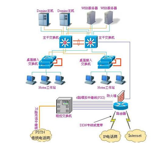 本公司综合布线工程严格遵循的标准与规范如下: 1、《ISO/IEC11801用户建筑通用布线标准》 2、《EIA/TIA568A,EIA/TIA568B》 3、《GB/T 50311-2000 建筑与建筑群综合布线系统工程设计规范》 4、《GB/T 50312-2000 建筑与建筑群综合布线系统工程验收规范》 本公司机房建设遵循的规范要求如下: 1、《电子计算机机房设计规范》(GB50174-93) 2、《电子计算机机房施工及验收规范》(SJ/T30003-93) 综合布线模拟拓扑图